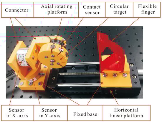 To verify the contact and deformation performance of the flexible fingers, a test device was designed (shown in Figure 10). First, all the fingers were fabricated through 3D printing, employing thermoplastic polyurethane elastomer (TPU) with a hardness of 95 Shore A. The test flexible finger was fixed on a horizontal platform. Finally, the target was fixed to the test platform through the X-axis sensor, Y-axis sensor and connectors. Five contact sensors were installed circumferentially on the right side of the target. The X-axis sensor and Y-axis sensor used in the experiment are the compression sensor, which are provided by Zhongnuo Chuanli, China, and the model is ZNLBM-IIX. Each sensor has a measuring range of 0∼500 N and an accuracy of 0.15 N. The contact sensor model is ZNLBM-X, and each sensor has a measuring range of 0∼100 N and an accuracy of 0.03 N. To simultaneously measure the grasping force exerted on the object along the X-axis and Y-axis, a connector was designed to connect the two sensors, as shown in Figure 10.