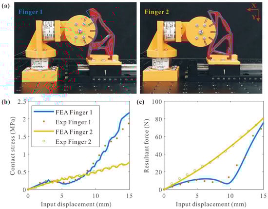 FEA and experimental results of two fingers: (a) deformation results, (b) contact stress response, (c) resultant force response.