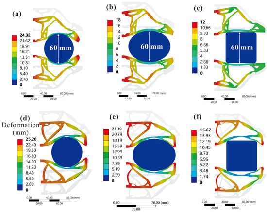 Shape adaptability FEA results: translational gripper 1 grasps the (a) circular target, (b) oval target, (c) square target. Translational gripper 2 grasps the (d) circular target, (e) oval target, (f) square target.