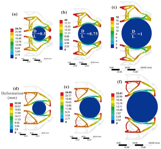 Size adaptability FEA results: translational gripper 1 grasps the circular target with (a) , (b) , (c) . Translational gripper 2 grasps the circular target with (d) , (e) , (f) .