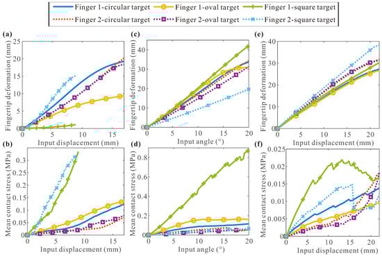 From Figure 14c,d, it becomes evident that most fingertip deformations of the angle gripper change linearly when grasping different shaped targets. Nonlinear increases occur only when angle gripper 1 grasps the oval target at a larger input angle. Furthermore, the fingertip deformations of angle gripper 1 and gripper 2 are very close when grasping circular targets, with angle gripper 2 exhibiting smaller deformations for the other two shapes. When grasping targets of three shapes, the mean contact stress of angle gripper 2 is consistently smaller than that of gripper 1. Figure 14e,f illustrate that when the active gripper grasps objects of different shapes, fingertip deformation exhibits linear growth under small input displacement, becoming nonlinear for larger displacements. Moreover, throughout the entire grasping process, the fingertip deformation of active gripper 2 surpasses that of gripper 1. For circular and oval targets, the mean contact stress of active gripper 2 is smaller than that of gripper 1 under small displacement loading. However, when the input displacement exceeds 18 mm, the mean contact stress of gripper 1 becomes smaller. Notably, the mean contact stress of active gripper 2 is consistently smaller than that of gripper 1 when grasping square targets. In conclusion, the results indicate that the three grippers by finger 2 exhibit good shape adaptability, maintain small contact stress, and perform better when grasping targets with a certain curvature.