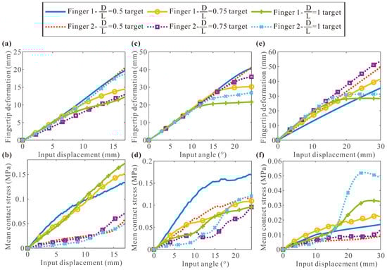 In Figure 14a,b, it can be observed that when the translational grippers grasp targets of different shapes, fingertip deformation and mean contact stress increase with the input displacement. For small input displacements, the growth is linear. However, for excessively large input displacements, it becomes nonlinear. Specifically, the fingertip deformation of translational gripper 1 is larger than that of gripper 2 when grasping circular targets. As the input displacement increases, the fingertip deformation of gripper 2 approaches or even exceeds that of gripper 1. Notably, throughout the entire process of the translational gripper grasping an oval target, the fingertip deformation of gripper 2 consistently surpasses that of gripper 1. Additionally, the mean contact stress of gripper 2 is consistently smaller than that of gripper 1 during the process of grasping both circular and oval targets. The indices related to the square target differ significantly due to all the grippers contacting the square target at the corners. The mean contact stress of translational gripper 2 is generally larger than that of gripper 1, but the fingertip deformation of gripper 2 consistently surpasses that of gripper 1 when grasping the square target. Figure 12c,f further reveal that the grasping effect of gripper 2 is better. These results collectively suggest that translational gripper 2 is more suitable than gripper 1 for grasping circular and oval targets. Despite the higher contact stress when grasping square targets, translational gripper 2 still demonstrates good shape adaptability.