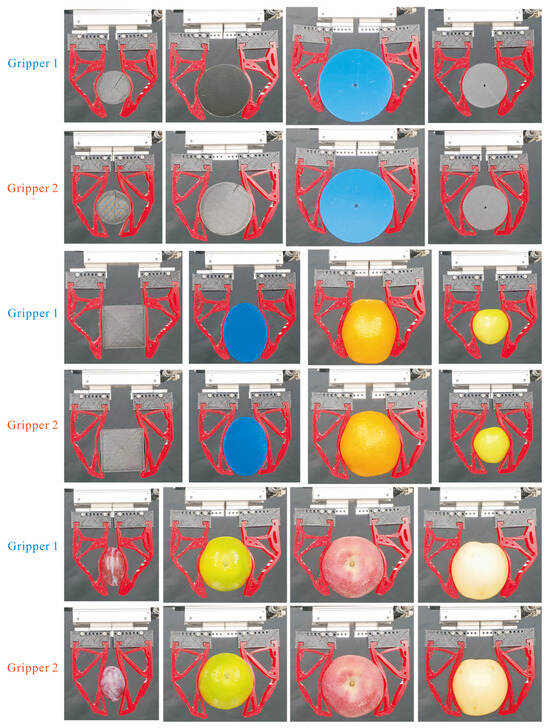 To assess the size adaptability of the flexible fingers, six types of grippers were used to grasp circular targets of different diameters, and the target-to-finger length ratios () changed within . Figure 13 shows part of the size adaptability results of the translational grippers. The analysis focused on the two grippers’ performance in grasping circular targets with different sizes, whose , , and 1, respectively. The results indicate that all grippers exhibit effective adaptation to the targets of different sizes. Gripper 1 shows a general wrapping effect. In contrast, gripper 2 showed great wrapping for all target sizes. This difference is mainly reflected in the different deformation of the fingertips. As the size of the target object increases, the wrapping effect of the gripper 2 continues to improve, further proving the superior size adaptability of the flexible fingers.