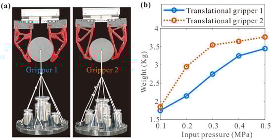 (a) Maximum payload test of the translational grippers, (b) payload test results for different input pressures.