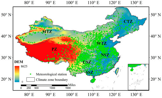 Spatial distribution of ground-based stations and climate zones. The climate zones are the cold temperature zone (CTZ), middle temperature zone (MTZ), plateau zone (PZ), warm temperature zone (WTZ), north subtropical zone (NSZ), central subtropical zone (CSZ) and south subtropical zone (SSZ). The background value is the land surface elevation.