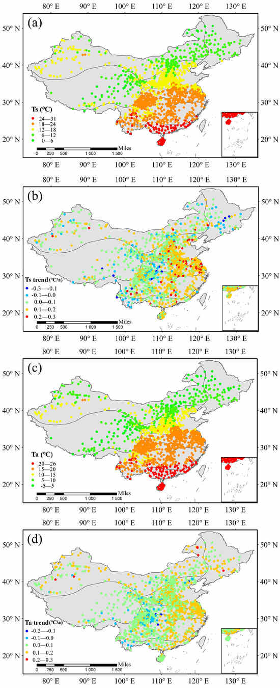 From 2011 to 2023, the average Ts in China showed a gradual decrease from low to high latitudes (Figure 3a), except in the Qinghai-Tibet Plateau region, where the overall temperature is relatively low due to high altitude. The multi-year average Ts is 16.41 °C. During the same period, Ta exhibited a similar spatial distribution pattern to the Ts (Figure 3c), with an average value of 13.64 °C, slightly lower than that of Ts. In terms of the change trends, the national average trends of change for Ts and Ta are 0.09 °C/a and 0.08 °C/a, respectively. Of these, 89.2% of the Ts and 94.2% of the Ta showed a warming trend from 2011 to 2023. In space, the trends of Ts and Ta gradually decrease from the eastern to the western regions (Figure 3b,d). Statistically, 41.3% of the regions showed significant changes in Ts (p < 0.05) and 45.40% of the regions showed significant changes in Ta (p < 0.05).