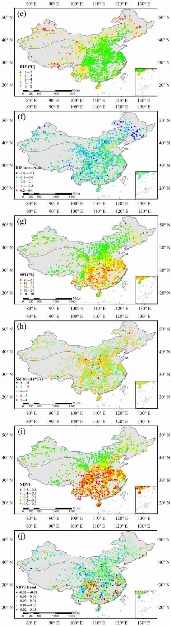 In this study, in situ Ts and Ta observations are used to calculate the DIF over China region. We explore the driving effect of SM and NDVI on DIF in different PRE gradients, DEM gradients and climate zones, respectively. All time series data used in this study were harmonized to monthly scale. The following sections provide further details of these datasets.