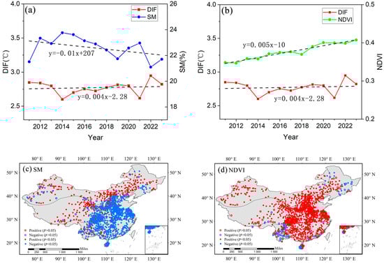 Inter-annual change in (a) DIF and SM and (b) DIF and NDVI and spatial correlation of (c) DIF and SM and (d) DIF and NDVI, 2011–2023. The dashed lines in figures (a,b) are the trend lines of change.