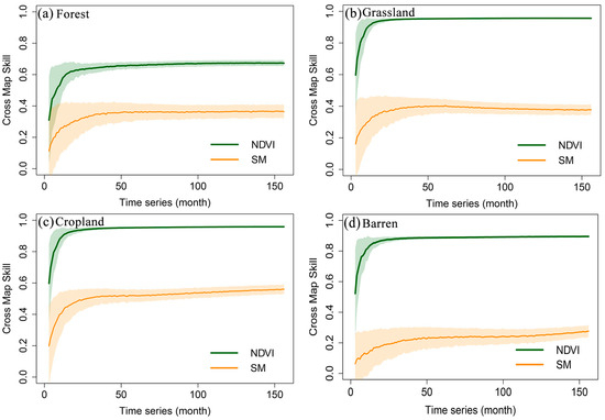 To further explore the driving effects of SM and NDVI on DIF, we employed the CCM causality analysis method to determine the causal relationships between SM, NDVI and DIF under different land surface cover types. This study selected forest, grassland, cropland and barren land surface types with distinct vegetation cover gradients for analysis. Figure 5 shows the causal relationship detection results of SM, NDVI and DIF in the four land surface cover types. It is evident that both SM and NDVI have driving effects on DIF, with NDVI exhibiting a significantly greater driving effect on DIF compared to SM.
