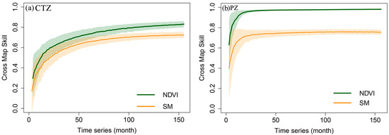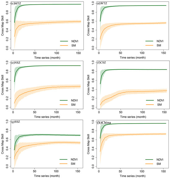 Climate types determine the temperature, humidity and vegetation of a region. The impact of different climate zones on the driving effect of NDVI and SM on DIF is shown in Figure 6. There is a causal relationship between SM, NDVI and DIF. The causal relationship between SM and DIF is weaker in the NSZ, CSZ and SSZ (cross-map skill less than 0.5), while it is stronger in the CTZ, MTZ, PZ and WTZ (cross-map skill greater than 0.5). This indicates that the strength of the causal relationship between SM and DIF increases with latitude and altitude. The overall causal relationship strength between NDVI and DIF is greater than that between SM and DIF, and in high-altitude climate zones, the causal relationship strength is greater than in low-altitude climate zones.