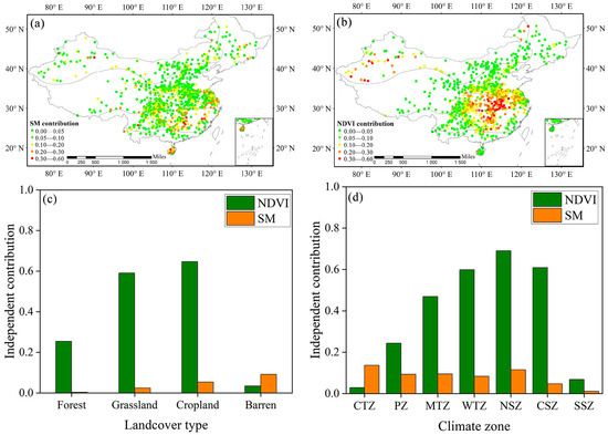 The previous section has confirmed the driving effect of SM and NDVI on DIF, so we further analyzed the contribution of SM and NDVI to DIF. Figure 7a,b show the spatial distribution of the contribution of SM and NDVI to the variation in DIF, respectively.