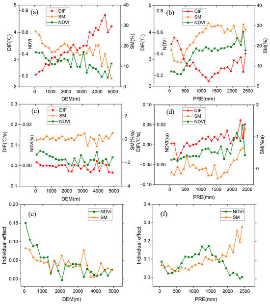 Characteristics of DIF, SM and NDVI over the DEM and PRE gradients. (a,b) are the multi-year mean values of DIF, SM and NDVI. (c,d) are the change trends of DIF, SM and NDVI. (e,f) are the contributions of SM and NDVI to DIF.