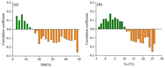 Different climatic backgrounds affect the influence patterns of SM change on DIF [19]. SM is a key influencing factor in heat capacity, controlling the rate of soil temperature variation, thereby affecting DIF. The intensity of vegetation evaporation is also affected by SM, which has a regulating effect on local Ts and Ta. Overall, the background values of SM can affect vegetation cover and soil evaporation directly and then affect DIF. Figure 9a characterizes the variation in the correlation coefficient between SM and DIF over different SM gradients. Differences in soil moisture content resulted in different patterns of SM influence on DIF. A positive correlation between SM and DIF was observed when SM was less than 13%, while a negative correlation between SM and DIF was observed when SM was greater than 13%. Figure 4a shows that the positive correlation between SM and DIF is mostly distributed in the MTZ and PZ regions, where SM is restricted with low vegetation coverage; the increase in SM accelerates the soil evaporation rate, which makes Ts warm up rapidly and thus enhances DIF. In contrast, in areas with high SM values, enhanced evapotranspiration has a cooling effect on Ts, thereby weakening DIF.