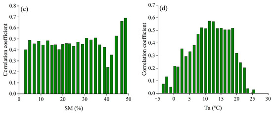Correlations between DIF and SM/NDVI under different SM or temperature background values. (a) Correlation between SM and DIF under different SM gradients. (b) Correlation between SM and DIF under different Ta gradients. (c) Correlation between NDVI and DIF under different SM gradients. (d) Correlation between NDVI and DIF under different Ta gradients.