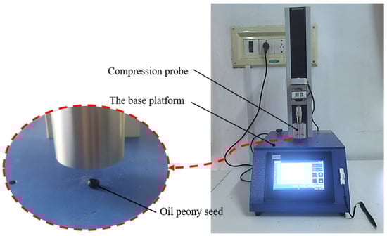 Twenty ellipsoidal and flat oil peony seeds were randomly selected, and compressed by using the TA.XTC-16 texture analyzer (BosinTouch Co., Shanghai, China) [22]. The oil peony seeds were placed on the test platform of the texture analyzer, and their original dimensions along the direction of thickness were recorded for the compression test (Figure 2). A cylindrical probe with a radius of 10 mm was utilized to this end; its initial height was set to 10 mm, while its speeds of travel and loading were set to 0.5 mm/s and 0.25 mm/s, respectively. After loading, the probe speed movement and the pressure limit were 0.5 mm/s and 17,000 gf. The force–displacement data obtained during the compression test was utilized to calculate the elastic modulus of the seeds through Equation (1).