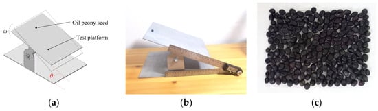 The friction coefficient of oil peony seeds was measured by the inclined plane method [23]. Seeds of similar thicknesses were selected and arranged densely on A4 printing paper to form a seed board (Figure 3). During the test, the seed was set on the device used to measure the friction coefficient (or was fixed on the seed plate on the device). The angle of inclination of the test platform was then gradually increased manually until the seed tended to slide (or roll) downward along the incline and then stopped moving. The angle θ of the test platform was subsequently recorded. Oil peony seeds are mainly divided into two categories with ellipsoidal and flat shapes, where the former are prone to rolling. To ensure the accuracy of the experimental data, 10 flat, randomly selected oil peony seeds were used for three repeated tests of the FSC, and ten ellipsoidal seeds were used for three repeated tests of RFC. The friction coefficient, calculated using Equation (3), was represented by its average value.