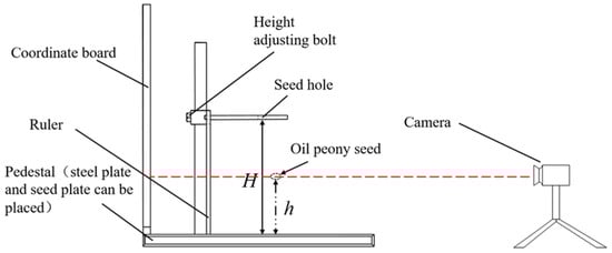 The CRC from collisions between oil peony seeds and between seeds and contact material was determined by the vertical drop test (Figure 4) [24]. Coordinate paper was provided on the far left of the measuring device, with the vertical distance H between the seed hole and the contact material set at 300 mm. Fifty oil peony seeds were randomly selected for the measurements, which were taken by using a high-speed camera (Olympus Corporation, Tokyo, Japan) after the seeds had freely fallen in the seed hole and bounced off the contact material. Due to the irregularity of the outline of the oil peony seeds, we chose 20 seeds that had vertically sprung back up after collision and recorded their greatest height. According to its physical definition, the CRC between the peony seed and the contact material is the ratio of its relative velocity of separation after collision and its relative approaching velocity before collision [25,26,27]. Because the velocity of the contact material before and after the collision was zero, Equation (4) can be used to calculate the CRC.