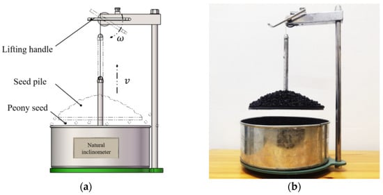Using an inclinometer (model DT-1) to measure the repose angle of oil peony seeds (Figure 5). The device was placed on a horizontal test bench. The lifting platform was placed inside the material tank, which was then filled with seeds. The handle was used to lift the lifting platform to the top of the material tank slowly and at a constant speed, such that the seeds left on the lifting platform formed a repose angle.