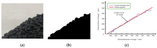 Three tests were conducted, and a high-speed camera was utilized to photograph images of the seed pile (Figure 6a). MATLAB was used to process the images in grayscale, binarize them (Figure 6b), extract their boundaries, and linearly fit them (Figure 6c) [28,29].