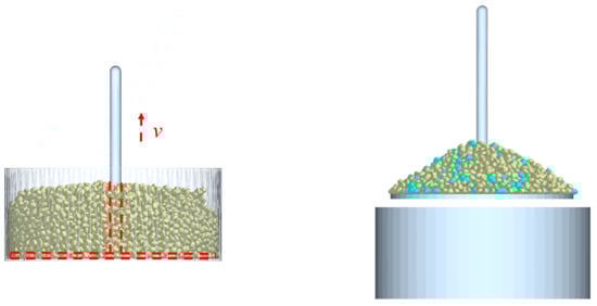 Based on their measured average sizes, three-dimensional modeling software was utilized to establish representative three-dimensional models of the flat and ellipsoid oil peony seeds and applied the Hertz–Mindlin (no slip) contact model to build their DEM (Figure 7). Simulations of the ellipsoidal and flat seeds, at a ratio of 19:6, in the material tank were conducted, where the number of seeds was 10,000. When the particles of the seeds had attained a stable state, the disk-lifting platform was moved to the top of the material tank at a speed of 0.1 m/s along the Z-axis, and the seed particles on it fell under the action of gravity. The seeds that eventually remained on the platform created a stable repose angle (Figure 8).