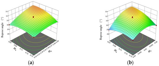 According to the results of the variance analysis (Table 8), the interaction terms M4M6 and M4M7 had a significant impact on the repose angle (p < 0.05). The response surfaces of interactions between M4M6 and M4M7 were drawn by using parameters other than the fixed interaction terms at the central level (Figure 9). The effect of interaction between these parameters is intuitively clear from it. When M5 and M7 were at the central level, the repose angle gradually increased with M4 and M6. When M5 and M6 were centered horizontally, the repose angle gradually increased with M4 and M7.