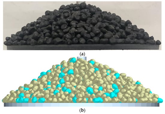 The optimal parameter combination obtained above was simulated to verify its accuracy. The repose angles obtained in three repeated simulations were 30.1°, 30.5°, and 31°, with an average value of 30.5°. The error between the simulated (Figure 10b) and measured repose angles (Figure 10a) was only 0.67%, indicating that the parameters of the calibrated DEM were reliable.