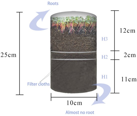 As shown in Figure 1, a total of 1.8 kg of the as-prepared soil was put into a cylindrical container with a height of 25 cm and a diameter of 10 cm and a soil bulk density of 1.2 g/cm3. Two layers of 300-mesh filter cloth were used to separate the rhizosphere (H3) from the non-rhizosphere environments (H1 and H2). A total of 40 sugar beet seeds were sown on the soil surface, located 5 cm above the upper layer of filter cloth. Then, 2 cm of soil was placed over them. Capillary force was used to manage the water during the growth of the sugar beet seedlings. The experiment was replicated four times. The seedlings were cultured under a photoperiod of 10/14 h, with a light intensity of 200 µmol/(m2·s) and a temperature of 25/20 °C. The soil microorganisms, amino acids, organic acids, and sugar content were analyzed after 50 days of cultivation.
