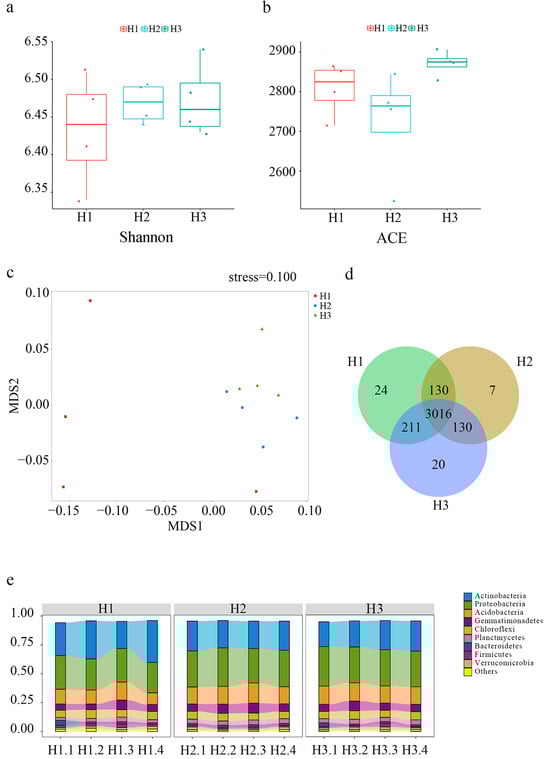 Alpha diversity analysis, using the Shannon (Figure 2a) and ACE (Figure 2b) indices, revealed higher values in the H3 region compared to H1 and H2, suggesting greater species diversity in the microbial community of H3. The non-metric multidimensional scaling (NMDS) plot using the Bray–Curtis dissimilarity algorithm demonstrated distinct clustering of bacterial communities from different environments (Figure 2c). Specifically, H2 and H3 clustered closely together and were significantly separated from H1, illustrating the substantial impact of rhizosphere environment on the composition of bacterial communities.