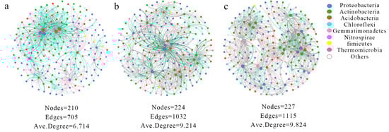 The study evaluated individual co-occurrence networks to determine the co-occurrence patterns of soil bacterial communities in different sugar beet root environments (Figure 3). Compared to H1 (201 nodes and 705 edges), both H2 and H3 had a higher number of associated nodes (224, 227) and edges (1032, 1115). The H2 and H3 networks also exhibited a higher degree of node connectivity. The average degree of the H2 network was increased by 37% compared to the H1 network, while the average degree of the H3 network was increased by 46%. Both H2 and H3 had a higher percentage of positive connections (50.48% and 51.57%), whereas the H1 network showed a negative connection percentage of 58.01%. The dominant phyla in each network remained Proteobacteria, Actinobacteria, and Acidobacteria, accounting for over 60% of the microbial community. Overall, the soil near the sugar beet roots exhibited a higher complexity in its bacterial community.