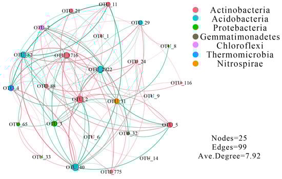 Furthermore, to explore the correlation between the dominant OTUs in the bacterial communities, we combined the three samples and selected the top 25 most abundant OTUs for co-occurrence analysis (Figure 4). The network had a total of 99 edges, with 52 edges representing positive correlations and 47 edges indicating negative correlations. The average degree of the network was 7.92, indicating good connectivity. Notably, OTU_65, classified as an ammonia-oxidizing bacteria, displayed strong positive correlations with OTU_3, OTU_4, OTU_33, and OTU_40. Specifically, OTU_4, representing nitrite-oxidizing bacteria, only exhibited a positive correlation with OTU_3.