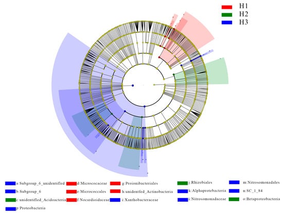 In linear discriminant analysis (LDA) with a threshold of 3.5, there were a total of 19 significantly different bacterial populations. The H1, H2, and H3 samples had 6, 3, and 10 different populations, respectively. Linear discriminant analysis effect size (LEfSe) was employed to assess the differences in the bacterial community composition (from “Phylum” to “Genus”). As shown in Figure 5, in the microbial community of H1 was predominantly enriched with Actinobacteria, including Nocardioidaceae, Propionibacteriales, and Micrococcaceae, which are less associated with nitrogen cycling. H2 showed enrichment primarily in Rhizobiales and Betaproteobacteria, which enhance nitrogen cycling functions. H3 exhibited enrichment in nitrogen-fixing Alphaproteobacteria, the organic-matter-degrading bacteria Xanthobacteraceae, and Nitrosomonadaceae, involved in the oxidation of ammonia into nitrites. Among them, H3 had a greater number of differential populations. This indicates that the roots of beets induce specific bacterial taxa, leading to distinct rhizosphere microbial communities compared to those in non-rhizosphere environments.
