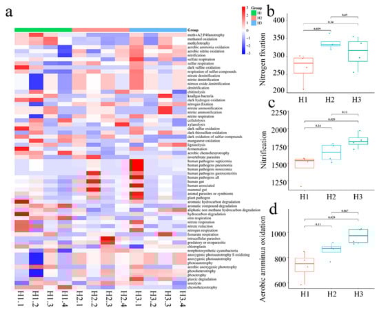 Microbial functional prediction. (a) Heatmap of the predicted functional profile for the microbial communities at the OUT level based on the Functional Annotation of Prokaryotic Taxa (FAPROTAX 1.1) database. The color code indicates relative abundance, ranging from blue (negative correlation) to red (positive correlation). (b–d) Boxplots for nitrogen fixation, nitrification, and aerobic ammonia oxidation, respectively.