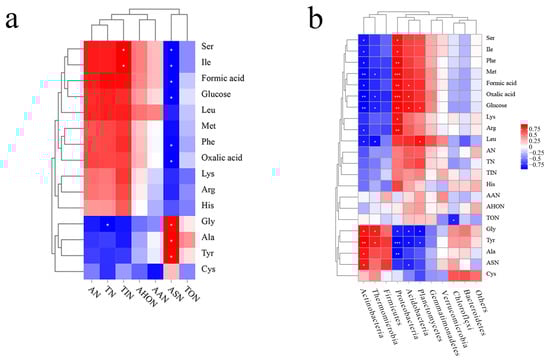 Correlation analysis between soil components and dominant bacteria. (a) Heatmap of the correlations between soil nitrogen content and root exudates. (b) Heatmap of the correlations between dominant bacterial community and soil nitrogen content and root exudates. *** means p < 0.001; ** means p < 0.01; * means p < 0.05. The color codes indicate relative abundance, ranging from blue (negative correlation) to red (positive correlation).