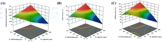 As shown in Figure 1A–C, 3D surface plots are useful for visualizing the relationship between parameters for a response. The interaction terms (i.e., agitation–solid loading, DE) were statistically significant for all responses (Table 6). Accordingly, it was observed that there were synergistic effects of agitation–solid loading for TPC (Figure 1A), ABTS activity (Figure 1B), and DPPH activity (Figure 1C). The highest value of TPC, ABTS activity, and DPPH activity was found at agitation (D) = 200 rpm and solid loading (E) = 175 g/L, while the lowest value was at agitation (D) = 200 rpm and solid loading (E) = 75 g/L.