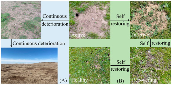 Succession process of degraded alpine meadow patches: (A) persistent deterioration of patches and (B) succession of four restoration stages in patches.