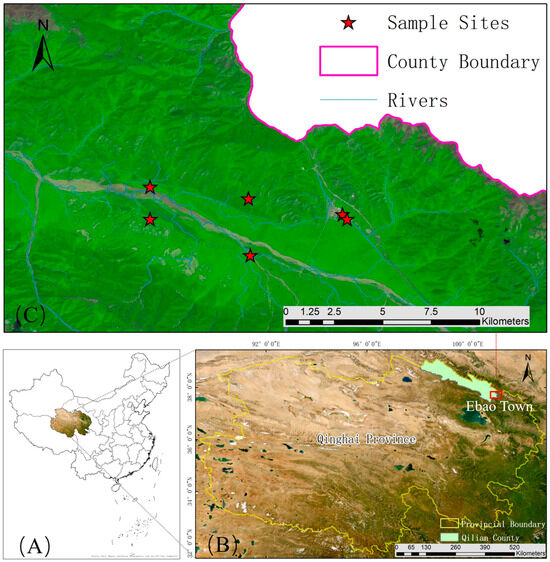 Geographic location of the study area: (A) geographic location of Qinghai Province; (B) geographic location of Ebao Town; (C) detailed deployment of six sample plots in Ebao Town.