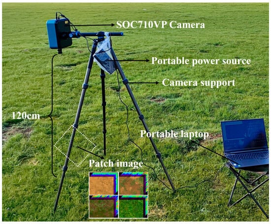 Hyperspectral image acquisition system. The hyperspectral camera (SOC710VP), mounted on a tripod and controlled via a portable computer, was used for data collection in Ebao Town.