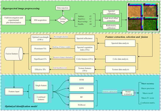 In recent years, hyperspectral imaging (HSI) technology has been widely used in smart agriculture because of its ability to capture the rich spectral information of features [17]. HSI technology combines the advantages of machine vision and spectral analysis and is able to acquire three-dimensional data cubes containing numerous consecutive spectral bands. Through the in-depth analysis of these data, the detailed spectral features of each pixel point can be used as an effective prediction basis for stage identification [18,19]. In addition, machine learning techniques have demonstrated excellent capabilities in processing large amounts of complex data. By combining different features of images, efficient regression and classification models can be constructed. Mansour et al. [20] studied grassland degradation in Okhombe shared grazing land in South Africa by analyzing canopy hyperspectral reflectance to differentiate between four classes of grasses representing different levels of degradation. They used the random forest (RF) algorithm combined with the forward variable selection technique to select a set of effective feature sets containing eight key wavelengths among a large number of wavelengths, achieving good classification accuracy (88.64%). Guan et al. [21] applied hyperspectral technology to the estimation of soil organic matter content in the degraded grassland of Sanjiangyuan, and confirmed the excellent performance of the RF model in predicting soil organic matter content. Gu et al. [22] conducted a study on the non-destructive detection of early tomato spotted wilt virus (TSWV) infection in tobacco by using HSI and machine learning technology. They used multiple wavelength selection methods with different classification models for comparative analysis, and finally determined that the model combining successive projection algorithms and boosted regression tree performed the best, with an accuracy of 85.2%. This consequently provides an effective method to achieve a fast and accurate non-invasive diagnosis of TSWV in early stages. Fu et al. [23] innovatively fused multispectral images from the Jilin-1 satellite (JL101K) and UAV platforms, and used the Gram–Schmidt algorithm to improve image quality, then made a breakthrough in the karst wetland vegetation classification problem. The results show that the light gradient boosting optimization model is the most advantageous classification model.