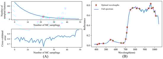 Wavelength selection process (A) and optimal wavelength distribution (B) (MC stands for Monte Carlo). Note: The red square represents the number of features selected under optimal sampling.