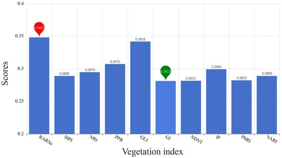 Vegetation index preferred feature scores. The red bubble represents the vegetation index with the highest score and the green bubble denotes the vegetation index with the lowest score.