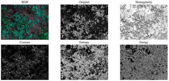 The texture of images reflects the physicochemical properties and structural features; a total of four TFs were extracted based on the gray-level co-occurrence matrix (GLCM) [46]. They are homogeneity, contrast, energy, and entropy, which are calculated by the following formulas: