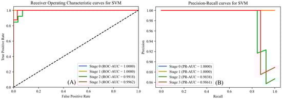 As shown in Figure 9, to further validate the classification performance of the SVM based on fused dataset A, we plotted the receiver operating characteristic (ROC) curves and precision–recall (PR) curves for each stage under the SVM, and calculated the area under the curve (AUC) for both ROC and PR curves to evaluate the model’s performance. From the figure, it is evident that the SVM model achieves ROC-AUC and PR-AUC values of 1 for S0 and S1, 0.9918 and 0.9838 for S2, respectively, and 0.9962 and 0.9861 for S3, respectively, which is a highly satisfactory result that strongly proves the SVM model’s excellent performance on this dataset.