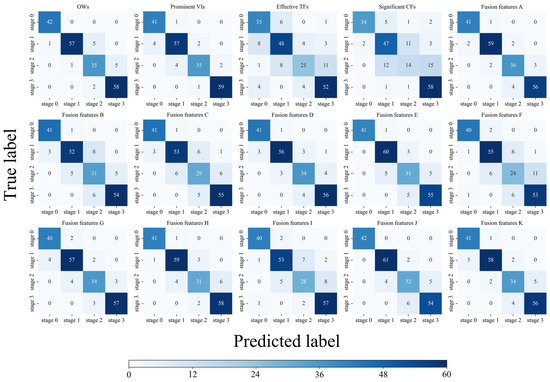 To evaluate the accuracy of model identification across each restoration stage, we depicted the confusion matrices of the optimal models derived from both the preferred feature datasets and the fused feature dataset in Figure 10. The five confusion matrices for each optimal model with five-fold hierarchical cross-validations are superimposed to obtain the final confusion matrix. After a careful analysis of the confusion matrix, we observed significant differences in the classification accuracy exhibited by the models for the different patch restoration stages. Specifically, for S0, the recognition accuracy is high, with almost no misclassification, and only very few samples are incorrectly categorized as S1, which suggests that the model has a high degree of specificity and accuracy in handling S0 samples. When turning to S1, we find that it is easily misidentified as S0, and there is also a case of being misidentified as S2. Furthermore, we note the complexity presented in the S2 identification process. Some of the S2 samples may be incorrectly determined as S1, and there are also cases of being misidentified as S3, which reveals that there may be subtle and indistinguishable feature intersections between S2 and S1 and S3, thus posing a test to the recognition ability of model. As for S3, the recognition performance of the model is outstanding, with the vast majority of samples being successfully recognized, and only a few instances being incorrectly classified as S2. This reflects that the model possesses a high degree of reliability and stability when dealing with S3 samples. Overall, S0 and S3 are the best identified, while S1 and S2 are slightly weaker but also effectively identified.