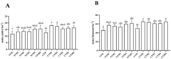 Maize yield (A) and biomass (B) for different systems in the study site. CT: conventional tillage, W: weeds, MO: monoculture, M1: hairy vetch (37.5 kg ha−1) + red clover (22.5 kg ha−1) + ryegrass (15 kg ha−1), M2: hairy vetch (37.5 kg ha−1) + red clover (22.5 kg ha−1) + triticale (15 kg ha−1), M3: triticale (7.5 kg ha−1) + ryegrass (7.5 kg ha−1) + hairy vetch (52.5 kg ha−1), M4: triticale (7.5 kg ha−1) + ryegrass (7.5 kg ha−1) + red clover (52.5 kg ha−1). The different lowercase letters are significantly different among cultivation times at the 0.05 probability level according to Duncan’s test.