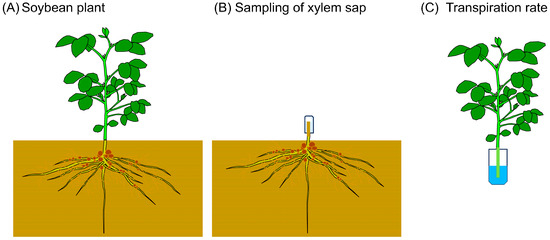 - Yamamura, Y.; Higuchi, K.; Saito, A.; Ohyama, T. Absorption and transport of phosphorus in nodulated soybean plants and diagnosis of phosphorus status using xylem sap analysis. Agriculture 2024, 14, 403. [Google Scholar] [CrossRef]