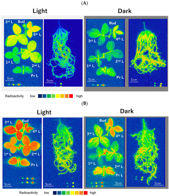 3.1.2. Comparison of the Radioactivity in the Shoots and Roots under Light and Dark Conditions