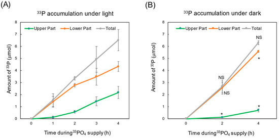 Comparison of 33P accumulation in the upper and lower part of soybean under light (A) and dark (B) conditions. * and NS indicate statistically significant at p < 0.05 and not significant using Student’s t-test between light conditions (A) and dark conditions (B). n = 3.