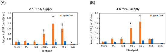 The amount of 33P in each part of the shoot under the light and dark conditions after 2 h and 4 h of 33Pi supply is shown in Figure 4. After 2 h of 33Pi supply under light conditions (Figure 4A), the amount of 33P in the third leaf was the highest among the organs, followed by the fourth leaf and the second leaf. On the other hand, under dark conditions, the amount of 33P in each leaf was lower than 0.04 μmol/plant at 2 h, and the 33P amounts under dark conditions were significantly lower in the second, third, and fourth leaves and buds than those under light conditions. The amount of 33P after 4 h of 33Pi supply (Figure 4B) was higher than that after 2 h, but the 33P labeling trends were similar to those of the results of 2 h. These results confirmed that a part of the P absorbed from the roots was transported to the shoot during a short period of 2 h to each leaf and bud, and some parts reached the apical bud either under light or dark conditions. Under light conditions, recently developed leaves, such as the second and the third leaves, accumulated a high amount of 33P compared with the older leaves (primary leaf and the first leaf) and developing leaf (the fourth leaf). Under dark conditions, a small amount of 33P was transported to each leaf and bud. However, the amounts were not high in the second, third, and fourth leaves compared with those under light conditions. This may be due to the lack of evapotranspiration under dark conditions.