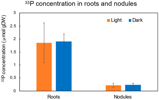 Comparison of 33P concentration in roots and nodules based on the dry weight under light and dark conditions after 4 h of 33PO4 supply. n = 3.
