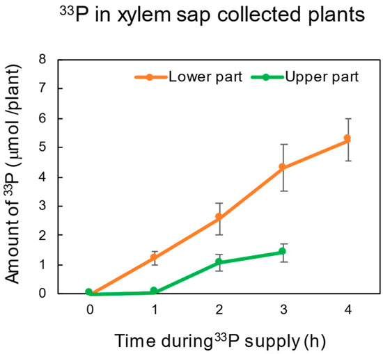Amount of 33P accumulation in the lower and upper part of soybean plants used for xylem sap collection under light conditions. The shoot was decapitated at 0, 1, 2, or 3 h after 33Pi supply, and the xylem sap was collected from the cut stump for 1 h. The lower part at 1, 2, 3, and 4 h, and the upper part at 0, 1, 2, and 3 h, were from the same plant, respectively. n = 3.